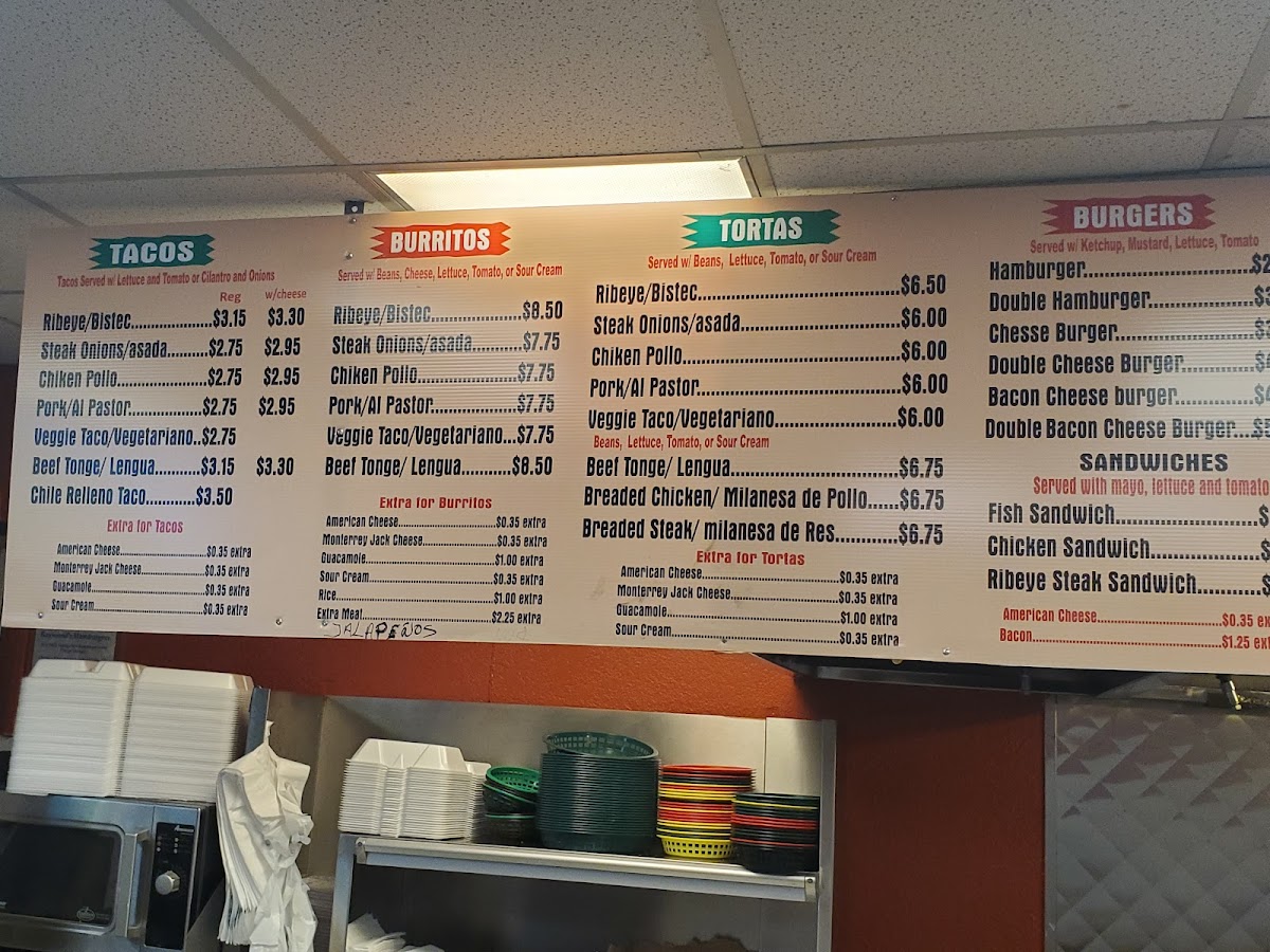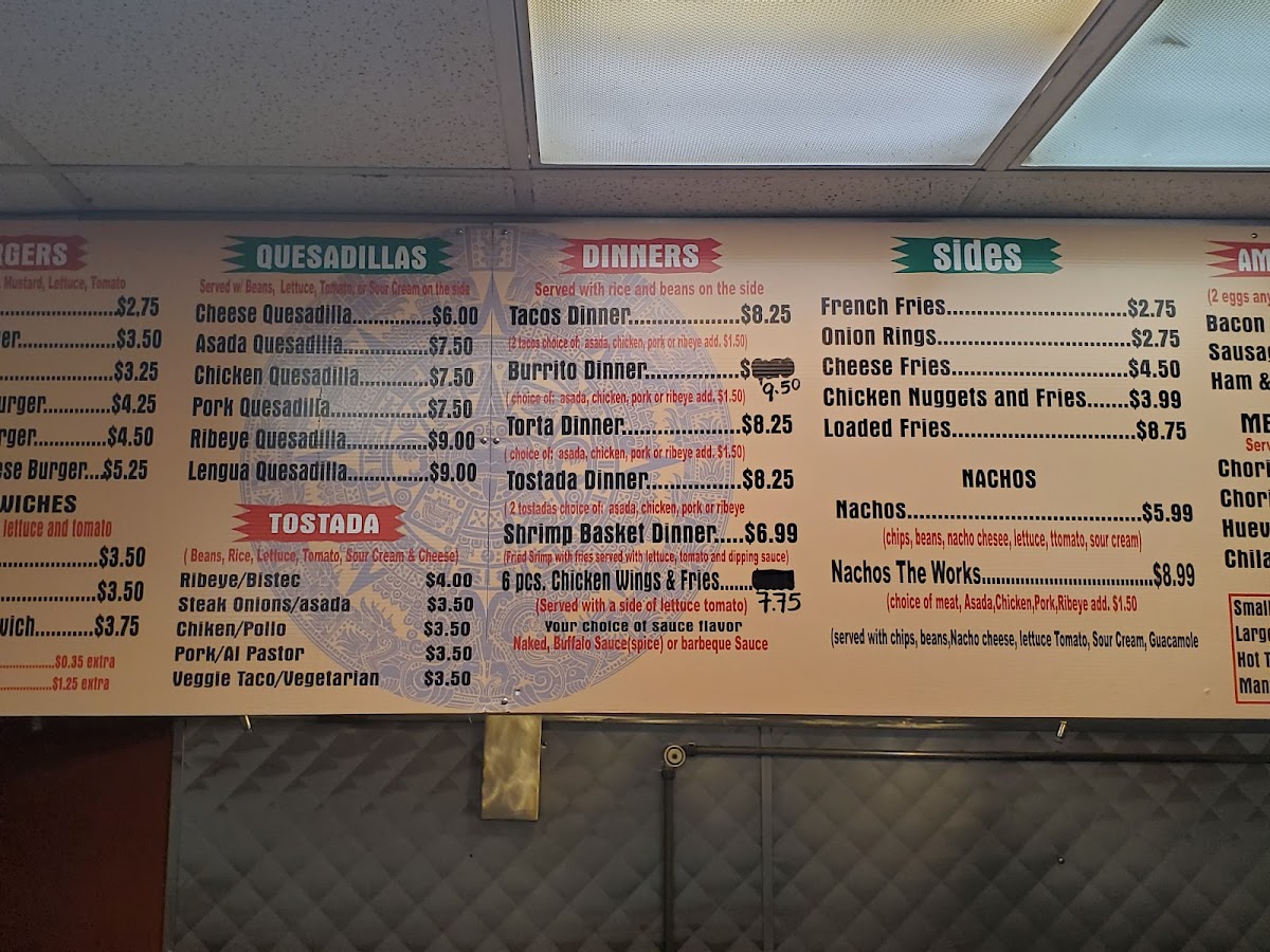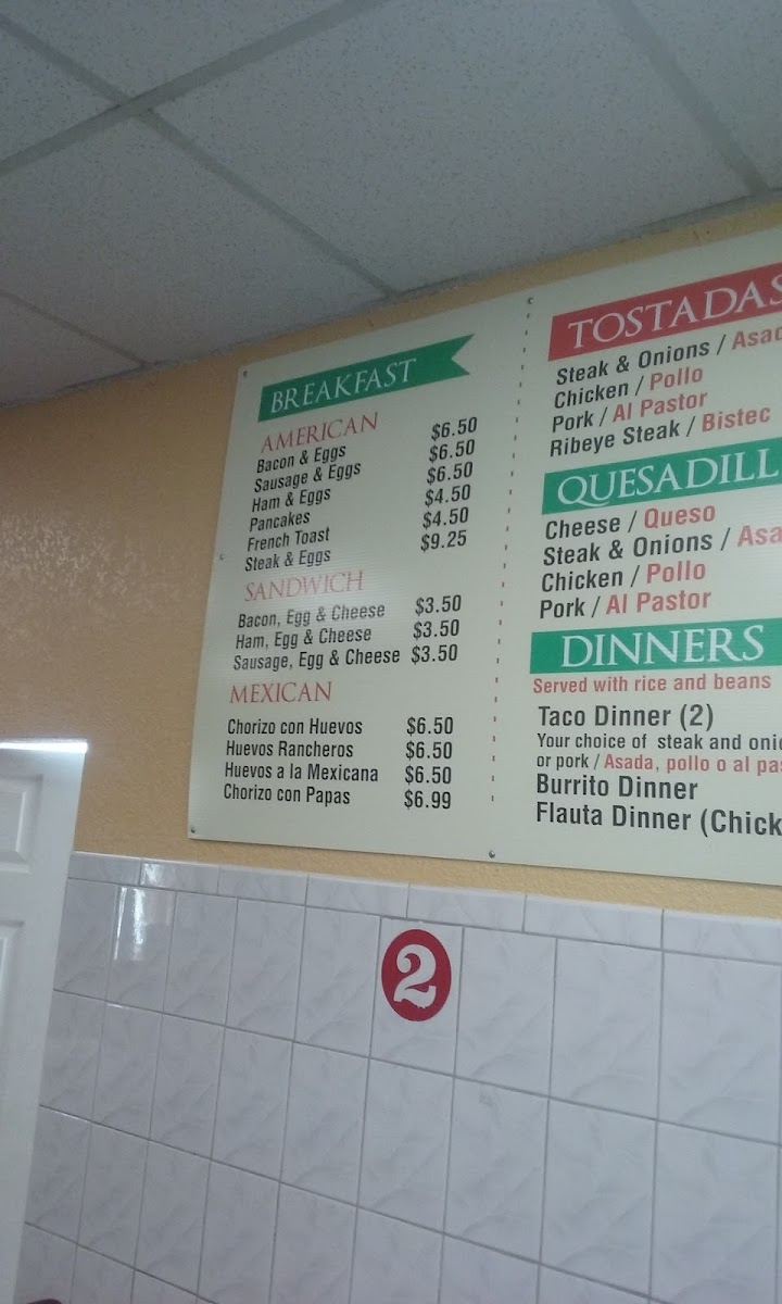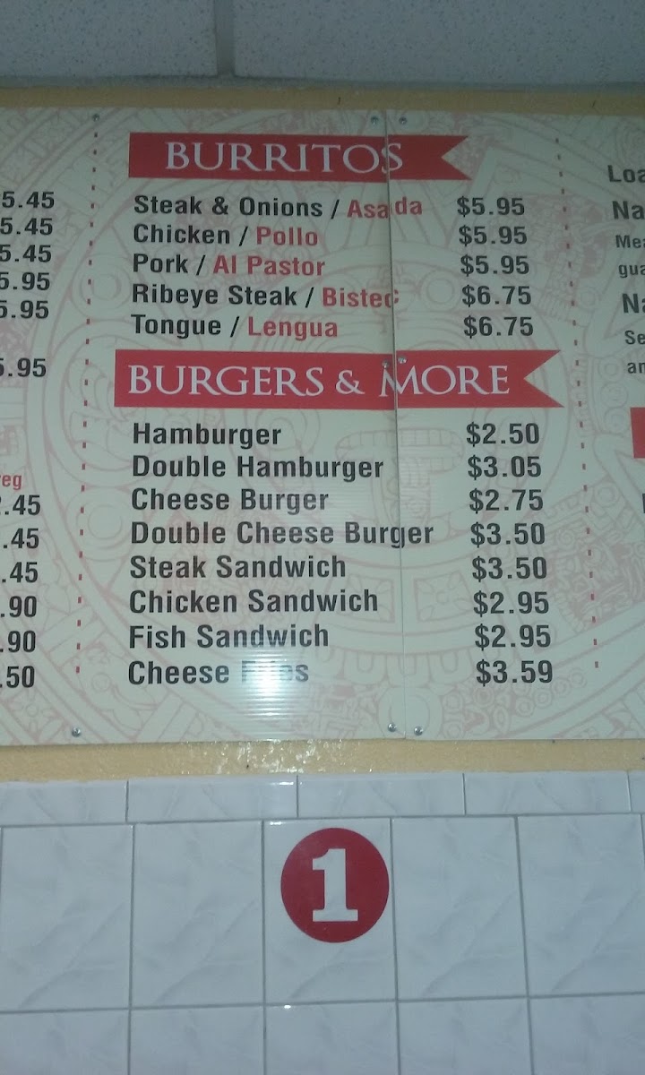 This menu offers options suitable for breakfast, lunch, or casual fast food dining, accommodating a range of tastes from Mexican specialties to American classics. The variety of items supports both quick individual orders and more substantial meals.