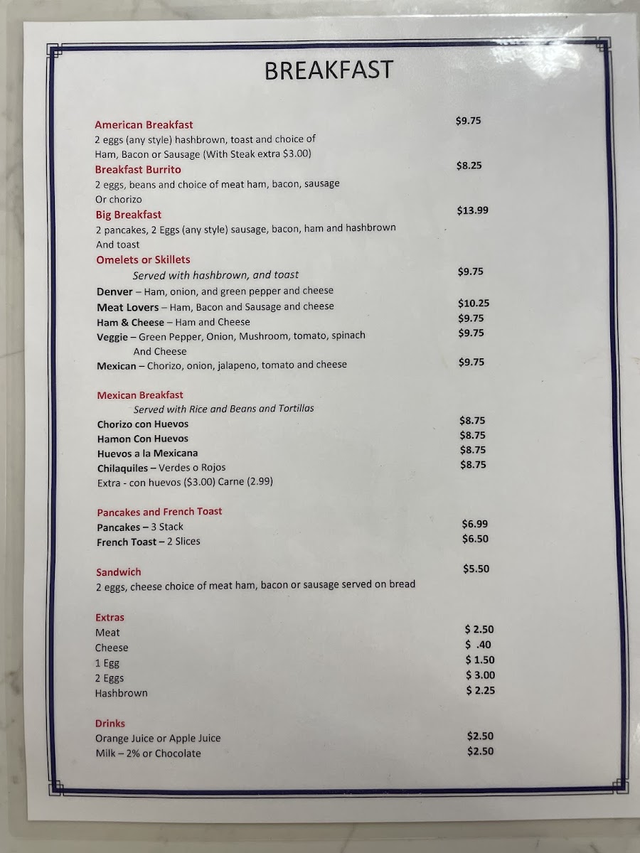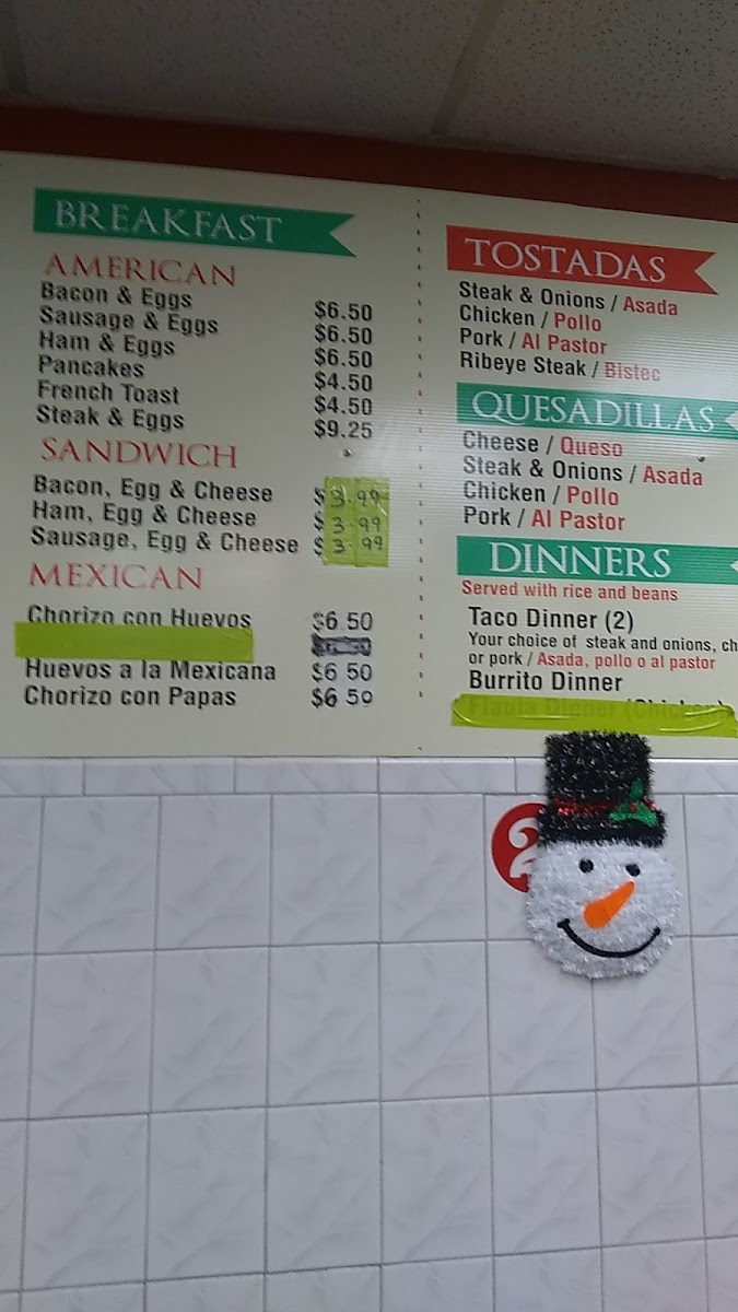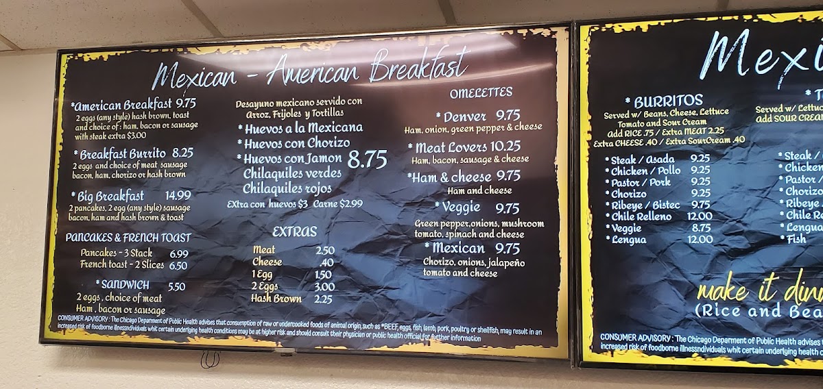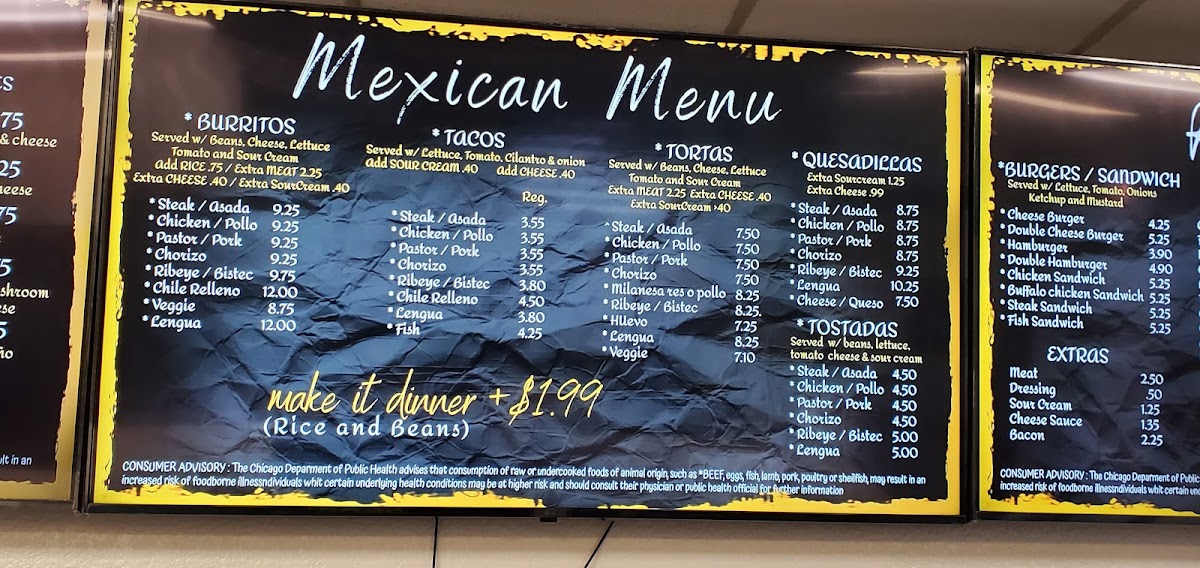 This menu offers options suitable for breakfast, lunch, or casual fast food dining, accommodating a range of tastes from Mexican specialties to American classics. The variety of items supports both quick individual orders and more substantial meals.